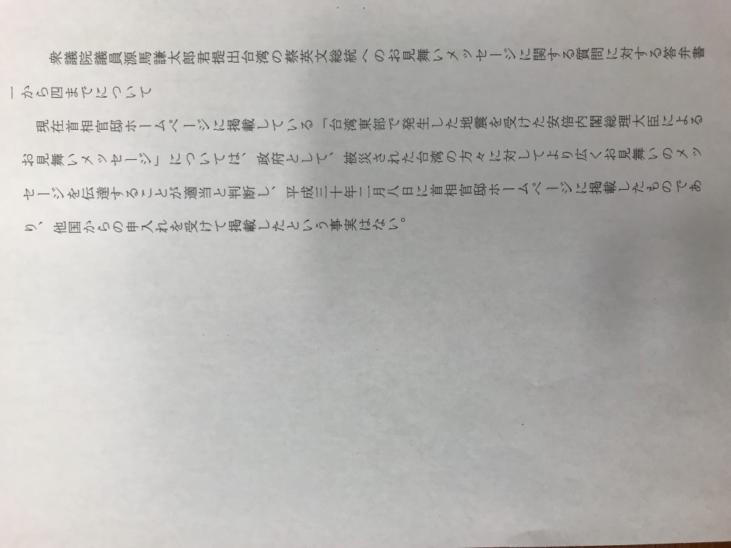 2月8日に首相官邸HPに公開された、台湾東部で発生した地震をうけた安倍総理からのお見舞いメッセーから、「蔡英文総統宛て」という文言が消えていたということを、こちらのネット記事で知りました。 官邸・台湾